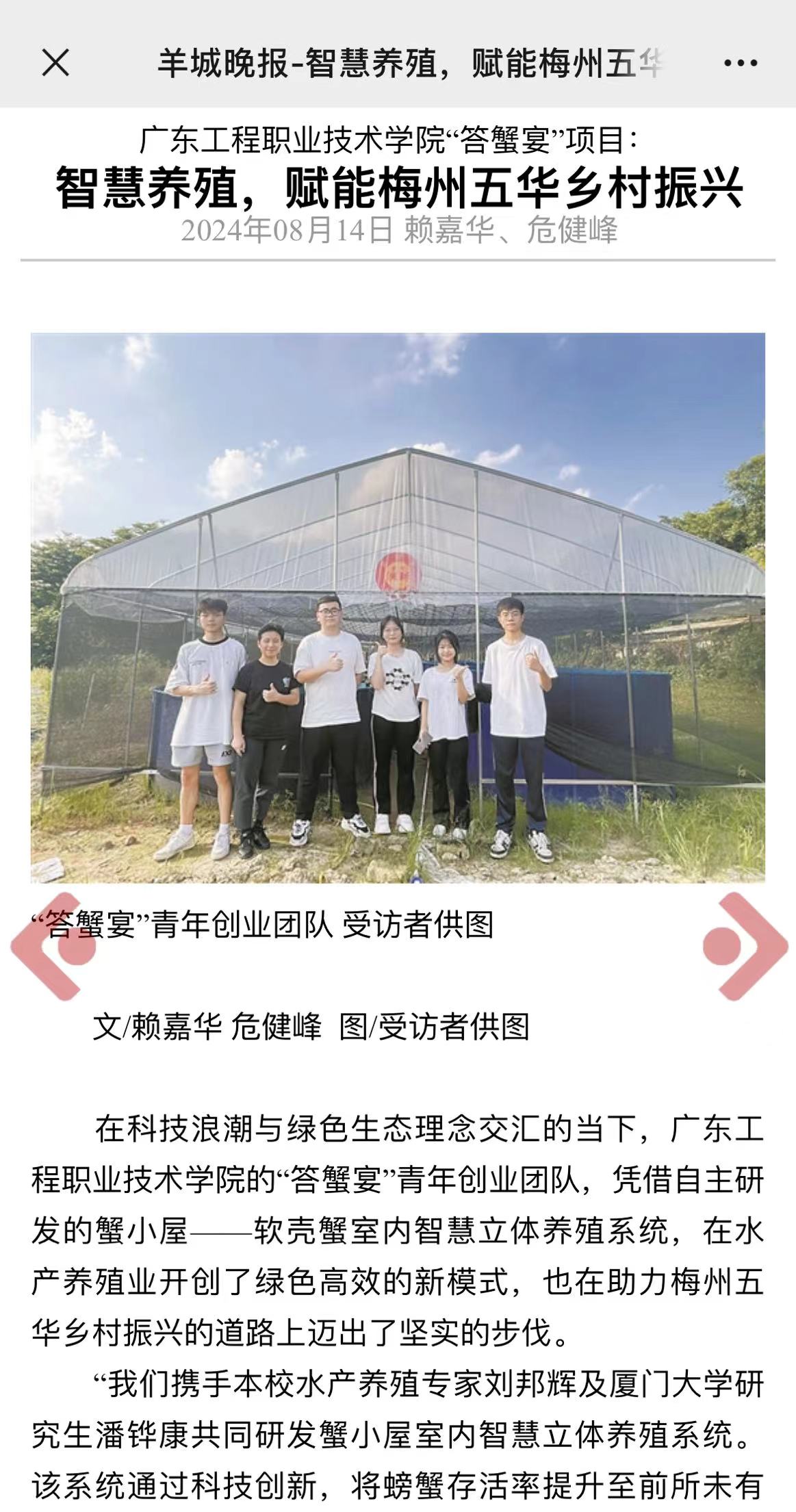 在科技浪潮與綠色生態(tài)理念交匯的當下,廣東工程職業(yè)技術(shù)學(xué)院的“答蟹宴”青年創(chuàng)業(yè)團隊,憑借自主研發(fā)的蟹小屋——軟殼蟹室內(nèi)智慧立體養(yǎng)殖系統(tǒng),在水產(chǎn)養(yǎng)殖業(yè)開創(chuàng)了綠色高效的新模式,也在助力梅州五華鄉(xiāng)村振興的道路上邁出了堅實的步伐。