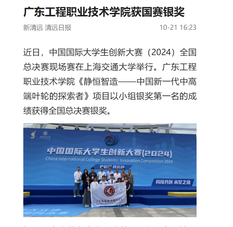 近日,中國國際大學生創(chuàng)新大賽(2024)全國總決賽現(xiàn)場賽在上海交通大學舉行。廣東工程職業(yè)技術(shù)學院《靜恒智造——中國新一代中高端葉輪的探索者》項目以小組銀獎第一名的成績獲得全國總決賽銀獎。