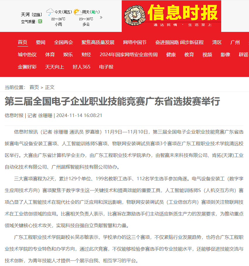 信息時(shí)報(bào)訊(記者 徐珊珊 通訊員 羅嘉維)11月9日—11月10日,第三屆全國(guó)電子企業(yè)職業(yè)技能競(jìng)賽廣東省選拔賽電氣設(shè)備安裝工賽項(xiàng)、人工智能訓(xùn)練師S賽項(xiàng)、物聯(lián)網(wǎng)安裝調(diào)試員賽項(xiàng)3個(gè)賽項(xiàng)在廣東工程職業(yè)技術(shù)學(xué)院清遠(yuǎn)校區(qū)舉行。大賽由廣東省計(jì)算機(jī)學(xué)會(huì)主辦,由廣東工程職業(yè)技術(shù)學(xué)院承辦,由智贏未來(lái)科技有限公司、肯拓(天津)工業(yè)自動(dòng)化技術(shù)有限公司、廣州超輝智能科技有限公司協(xié)辦。