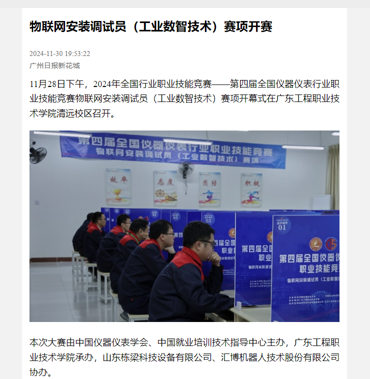 本次大賽由中國儀器儀表學(xué)會、中國就業(yè)培訓(xùn)技術(shù)指導(dǎo)中心主辦,廣東工程職業(yè)技術(shù)學(xué)院承辦,山東棟梁科技設(shè)備有限公司、匯博機器人技術(shù)股份有限公司協(xié)辦。