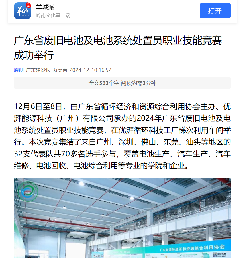 12月6日至8日,由廣東省循環(huán)經(jīng)濟和資源綜合利用協(xié)會主辦、優(yōu)湃能源科技(廣州)有限公司承辦的2024年廣東省廢舊電池及電池系統(tǒng)處置員職業(yè)技能競賽,在優(yōu)湃循環(huán)科技工廠梯次利用車間舉行。本次競賽集結(jié)了來自廣州、深圳、佛山、東莞、汕頭等地區(qū)的32支代表隊共70多名選手參與,覆蓋電池生產(chǎn)、汽車生產(chǎn)、汽車維修、電池回收、電池綜合利用等專業(yè)的學院和企業(yè)。