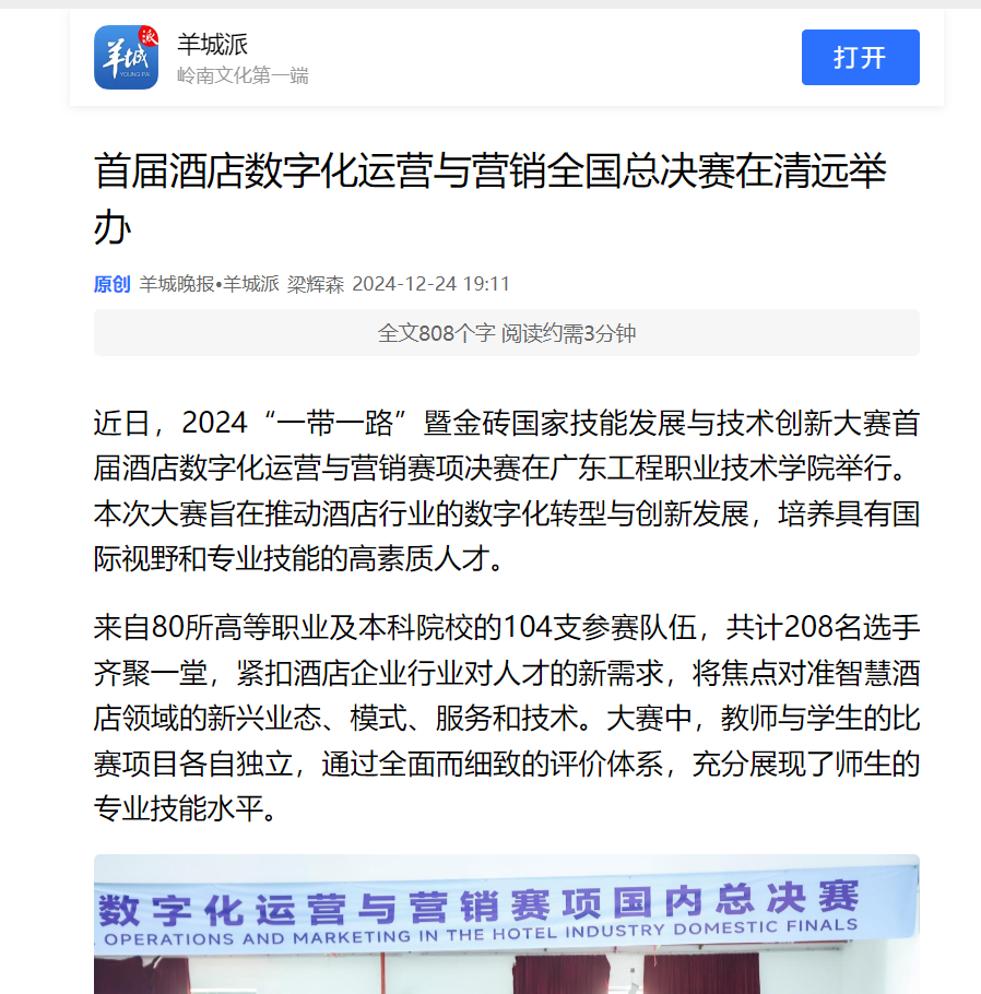 近日,2024“一帶一路”暨金磚國(guó)家技能發(fā)展與技術(shù)創(chuàng)新大賽首屆酒店數(shù)字化運(yùn)營(yíng)與營(yíng)銷(xiāo)賽項(xiàng)決賽在廣東工程職業(yè)技術(shù)學(xué)院舉行。本次大賽旨在推動(dòng)酒店行業(yè)的數(shù)字化轉(zhuǎn)型與創(chuàng)新發(fā)展,培養(yǎng)具有國(guó)際視野和專(zhuān)業(yè)技能的高素質(zhì)人才。