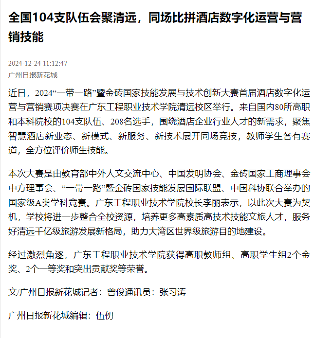 近日,2024“一帶一路”暨金磚國家技能發(fā)展與技術創(chuàng)新大賽首屆酒店數(shù)字化運營與營銷賽項決賽在廣東工程職業(yè)技術學院清遠校區(qū)舉行。來自國內(nèi)80所高職和本科院校的104支隊伍、208名選手,圍繞酒店企業(yè)行業(yè)人才的新需求,聚焦智慧酒店新業(yè)態(tài)、新模式、新服務、新技術展開同場競技,教師學生各有賽道,全方位評價師生技能。