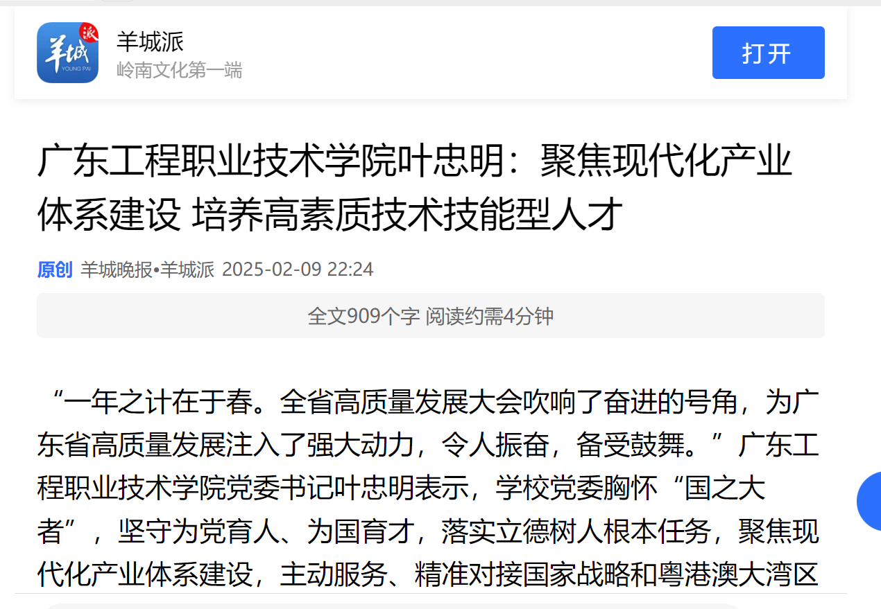 “一年之計(jì)在于春。全省高質(zhì)量發(fā)展大會(huì)吹響了奮進(jìn)的號(hào)角,為廣東省高質(zhì)量發(fā)展注入了強(qiáng)大動(dòng)力,令人振奮,備受鼓舞。”廣東工程職業(yè)技術(shù)學(xué)院黨委書記葉忠明表示,學(xué)校黨委胸懷“國之大者”,堅(jiān)守為黨育人、為國育才,落實(shí)立德樹人根本任務(wù),聚焦現(xiàn)代化產(chǎn)業(yè)體系建設(shè),主動(dòng)服務(wù)、精準(zhǔn)對(duì)接國家戰(zhàn)略和粵港澳大灣區(qū)發(fā)展需求,在深化改革創(chuàng)新中激發(fā)辦學(xué)活力,全力回答好“時(shí)代所問 國家所需 學(xué)校何為”時(shí)代課題,在廣東高質(zhì)量發(fā)展版圖中作出廣東工程的貢獻(xiàn)。