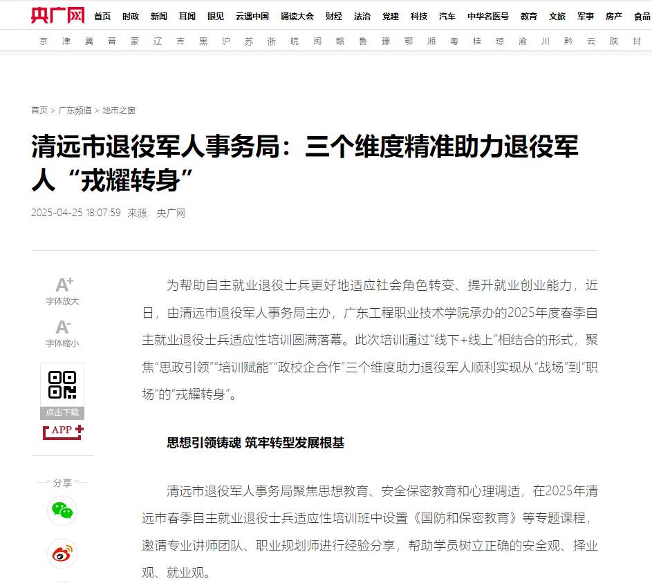 為幫助自主就業(yè)退役士兵更好地適應(yīng)社會(huì)角色轉(zhuǎn)變、提升就業(yè)創(chuàng)業(yè)能力,近日,由清遠(yuǎn)市退役軍人事務(wù)局主辦,廣東工程職業(yè)技術(shù)學(xué)院承辦的2025年度春季自主就業(yè)退役士兵適應(yīng)性培訓(xùn)圓滿落幕。此次培訓(xùn)通過“線下+線上”相結(jié)合的形式,聚焦“思政引領(lǐng)”“培訓(xùn)賦能”“政校企合作”三個(gè)維度助力退役軍人順利實(shí)現(xiàn)從“戰(zhàn)場(chǎng)”到“職場(chǎng)”的“戎耀轉(zhuǎn)身”。 思想引領(lǐng)鑄魂 筑牢轉(zhuǎn)型發(fā)展根基 清遠(yuǎn)市退役軍人事務(wù)局聚焦思想教育、安全保密教育和心理調(diào)適,在2025年清遠(yuǎn)市春季自主就業(yè)退役士兵適應(yīng)性培訓(xùn)班中設(shè)置《國(guó)防和保密教育》等專題課程,邀請(qǐng)專業(yè)講師團(tuán)隊(duì)、職業(yè)規(guī)劃師進(jìn)行經(jīng)驗(yàn)分享,幫助學(xué)員樹立正確的安全觀、擇業(yè)觀、就業(yè)觀。