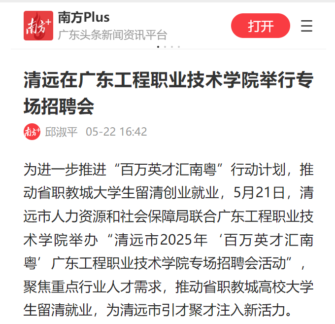 為進一步推進“百萬英才匯南粵”行動計劃,推動省職教城大學生留清創(chuàng)業(yè)就業(yè),5月21日,清遠市人力資源和社會保障局聯(lián)合廣東工程職業(yè)技術(shù)學院舉辦“清遠市2025年‘百萬英才匯南粵’廣東工程職業(yè)技術(shù)學院專場招聘會活動”,聚焦重點行業(yè)人才需求,推動省職教城高校大學生留清就業(yè),為清遠市引才聚才注入新活力。