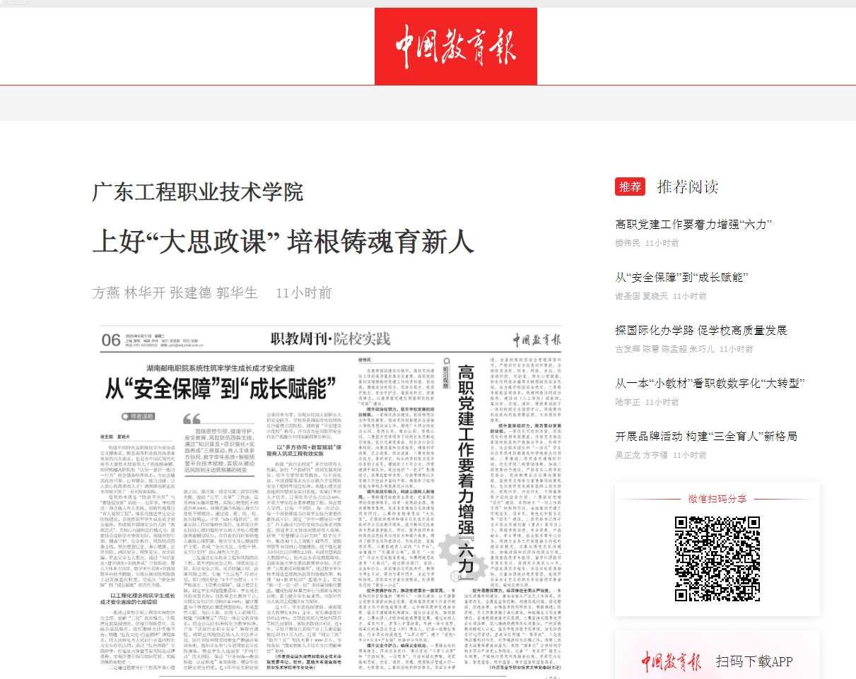 廣東工程職業(yè)技術(shù)學(xué)院聚焦“培養(yǎng)什么人、怎樣培養(yǎng)人、為誰培養(yǎng)人”這一教育的根本問題,持續(xù)深化思政課改革創(chuàng)新,將思政教育深度融入人才培養(yǎng)全過程,不斷推進(jìn)“大思政課”建設(shè),努力培養(yǎng)擔(dān)當(dāng)民族復(fù)興大任的時(shí)代新人。