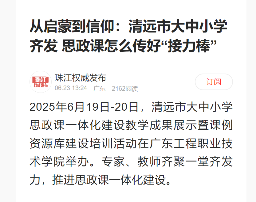 2025年6月19日-20日,清遠(yuǎn)市大中小學(xué)思政課一體化建設(shè)教學(xué)成果展示暨課例資源庫建設(shè)培訓(xùn)活動(dòng)在廣東工程職業(yè)技術(shù)學(xué)院舉辦。專家、教師齊聚一堂齊發(fā)力,推進(jìn)思政課一體化建設(shè)。