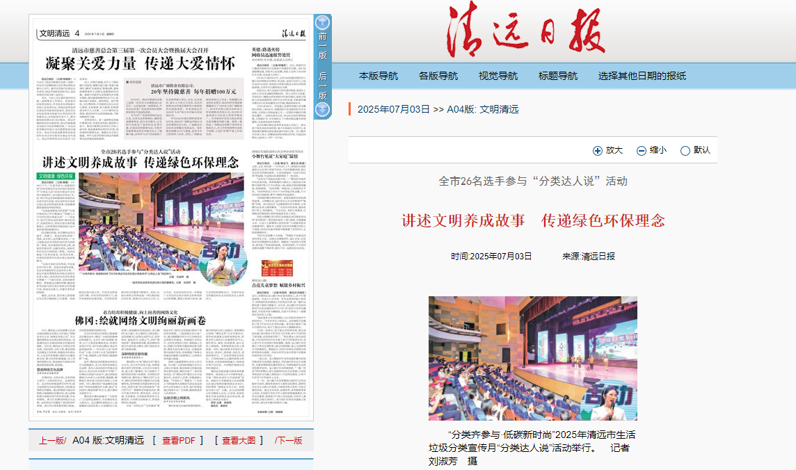 6月30日下午,“分類(lèi)齊參與·低碳新時(shí)尚”2025年清遠(yuǎn)市生活垃圾分類(lèi)宣傳月“分類(lèi)達(dá)人說(shuō)”活動(dòng)在清遠(yuǎn)市文化館小劇場(chǎng)舉行,來(lái)自清遠(yuǎn)市各縣(市、區(qū))各行各業(yè)及省職教城各高校的26名選手同臺(tái)競(jìng)演,用生動(dòng)的語(yǔ)言講述垃圾分類(lèi)文明養(yǎng)成的故事,用真摯情感傳遞綠色環(huán)保的理念。