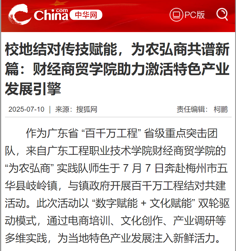 作為廣東省 “百千萬工程” 省級重點突擊團隊,來自廣東工程職業(yè)技術學院財經商貿學院的“為農弘商” 實踐隊師生于 7 月 7 日奔赴梅州市五華縣岐嶺鎮(zhèn),與鎮(zhèn)政府開展百千萬工程結對共建活動。此次活動以 “數字賦能 + 文化賦能” 雙輪驅動模式,通過電商培訓、文化創(chuàng)作、產業(yè)調研等多維實踐,為當地特色產業(yè)發(fā)展注入新鮮活力。