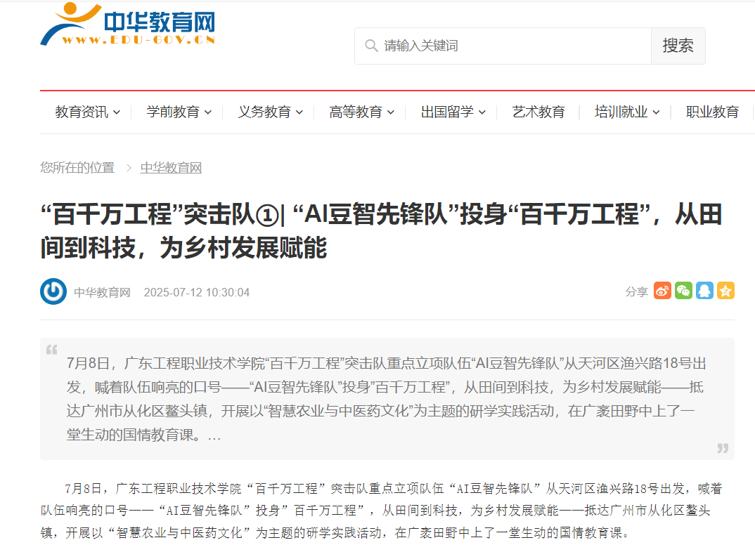 7月8日,廣東工程職業(yè)技術(shù)學(xué)院“百千萬工程”突擊隊重點立項隊伍“AI豆智先鋒隊”從天河區(qū)漁興路18號出發(fā),喊著隊伍響亮的口號——“AI豆智先鋒隊”投身”百千萬工程”,從田間到科技,為鄉(xiāng)村發(fā)展賦能——抵達(dá)廣州市從化區(qū)鰲頭鎮(zhèn),開展以“智慧農(nóng)業(yè)與中醫(yī)藥文化”為主題的研學(xué)實踐活動,在廣袤田野中上了一堂生動的國情教育課。