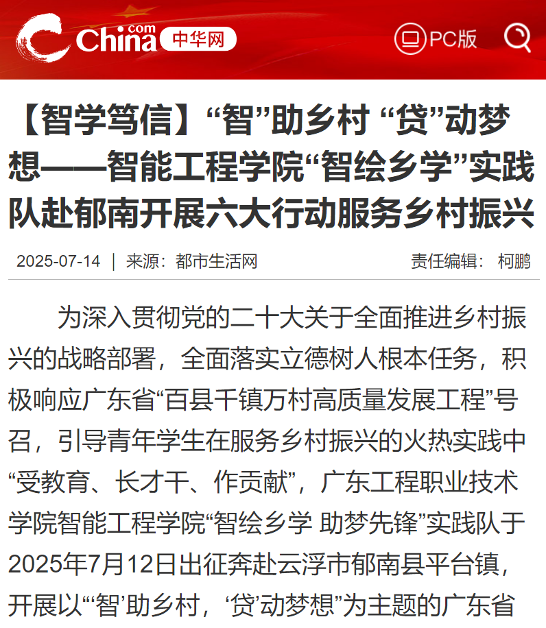 為深入貫徹黨的二十大關(guān)于全面推進(jìn)鄉(xiāng)村振興的戰(zhàn)略部署,全面落實(shí)立德樹(shù)人根本任務(wù),積極響應(yīng)廣東省“百縣千鎮(zhèn)萬(wàn)村高質(zhì)量發(fā)展工程”號(hào)召,引導(dǎo)青年學(xué)生在服務(wù)鄉(xiāng)村振興的火熱實(shí)踐中“受教育、長(zhǎng)才干、作貢獻(xiàn)”,廣東工程職業(yè)技術(shù)學(xué)院智能工程學(xué)院“智繪鄉(xiāng)學(xué) 助夢(mèng)先鋒”實(shí)踐隊(duì)于2025年7月12日出征奔赴云浮市郁南縣平臺(tái)鎮(zhèn),開(kāi)展以“‘智’助鄉(xiāng)村,‘貸’動(dòng)夢(mèng)想”為主題的廣東省“國(guó)家資助和助學(xué)貸款下鄉(xiāng)行”暨“多彩鄉(xiāng)村 向新而行”系列實(shí)踐活動(dòng)。