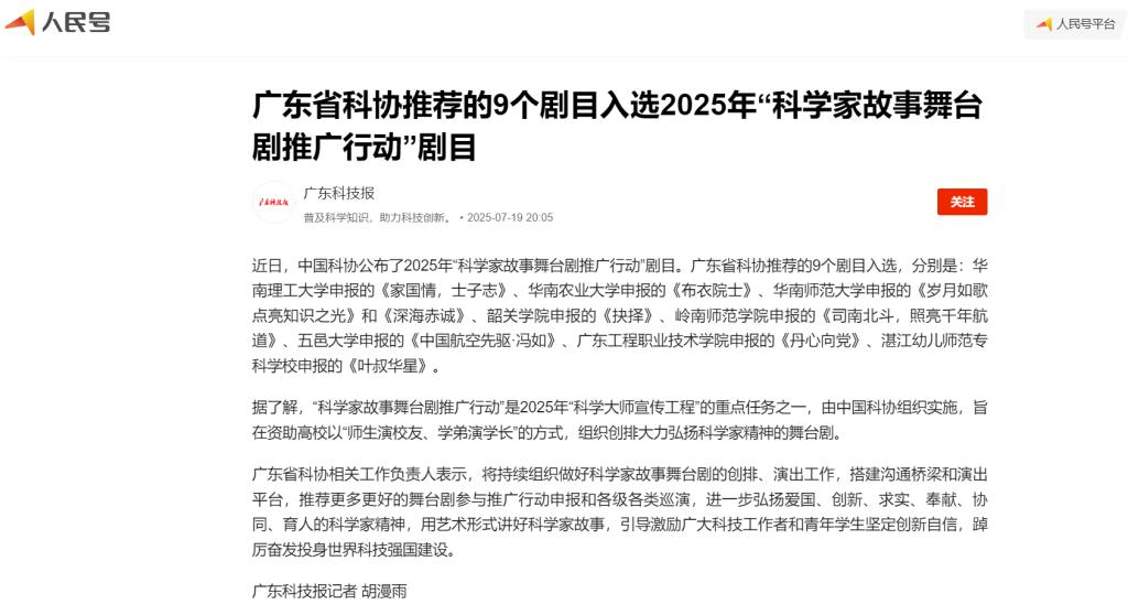近日,中國科協(xié)公布了2025年“科學(xué)家故事舞臺(tái)劇推廣行動(dòng)”劇目。廣東省科協(xié)推薦的9個(gè)劇目入選,分別是:華南理工大學(xué)申報(bào)的《家國情,士子志》、華南農(nóng)業(yè)大學(xué)申報(bào)的《布衣院士》、華南師范大學(xué)申報(bào)的《歲月如歌 點(diǎn)亮知識(shí)之光》和《深海赤誠》、韶關(guān)學(xué)院申報(bào)的《抉擇》、嶺南師范學(xué)院申報(bào)的《司南北斗,照亮千年航道》、五邑大學(xué)申報(bào)的《中國航空先驅(qū)·馮如》、廣東工程職業(yè)技術(shù)學(xué)院申報(bào)的《丹心向黨》、湛江幼兒師范專科學(xué)校申報(bào)的《葉叔華星》。