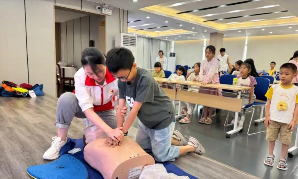 團(tuán)區(qū)委聯(lián)合高校實(shí)踐團(tuán)隊(duì)、城區(qū)紅十字會(huì)開(kāi)展防溺水科普課,結(jié)合夏季溺水高發(fā)案例,普及了防溺水安全知識(shí),強(qiáng)調(diào)“不私自下水”“不盲目施救”等“六不準(zhǔn)”原則,并現(xiàn)場(chǎng)演示了心肺復(fù)蘇(CPR)和AED使用技巧。在志愿者指導(dǎo)下,孩子們輪流上臺(tái)操作,學(xué)習(xí)如何判斷呼吸、定位按壓、使用AED設(shè)備,現(xiàn)場(chǎng)氣氛熱烈。