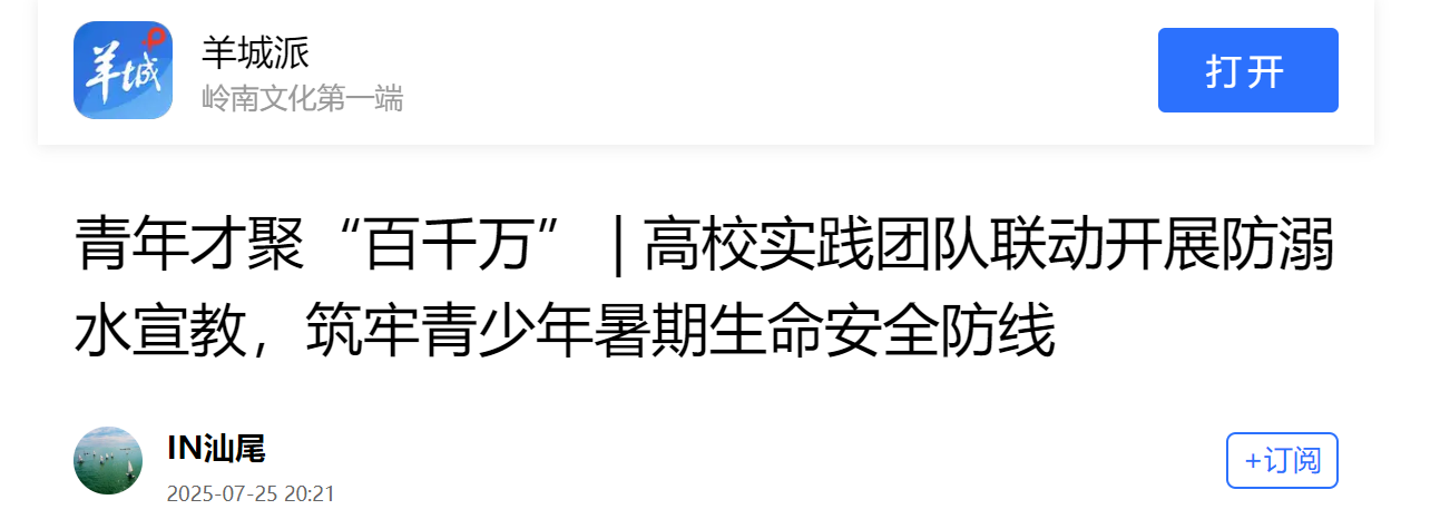 廣東交通職業(yè)技術(shù)學(xué)院“一樹(shù)千金”實(shí)踐團(tuán)在陸豐博美鎮(zhèn)蛟溪村開(kāi)展防溺水教育活動(dòng),通過(guò)模擬演練和故事講述,讓孩子們認(rèn)識(shí)到水域安全的重要性,學(xué)會(huì)自我保護(hù)與救援技能。