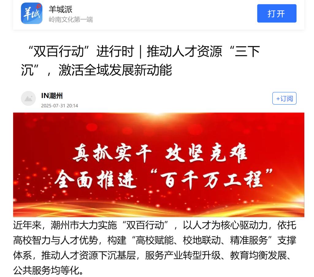 近年來,潮州市大力實(shí)施“雙百行動”,以人才為核心驅(qū)動力,依托高校智力與人才優(yōu)勢,構(gòu)建“高校賦能、校地聯(lián)動、精準(zhǔn)服務(wù)”支撐體系,推動人才資源下沉基層,服務(wù)產(chǎn)業(yè)轉(zhuǎn)型升級、教育均衡發(fā)展、公共服務(wù)均等化。