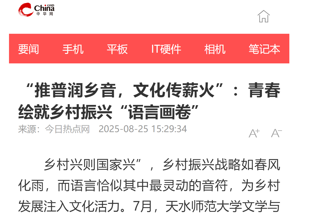 “鄉(xiāng)村興則國家興”,鄉(xiāng)村振興戰(zhàn)略如春風(fēng)化雨,而語言恰似其中最靈動的音符,為鄉(xiāng)村發(fā)展注入文化活力。7月,天水師范大學(xué)文學(xué)與文化傳播學(xué)院與廣東工程職業(yè)技術(shù)學(xué)院汽車工程學(xué)院學(xué)子組成的“朝陽”推普志愿服務(wù)隊,奔赴甘肅隴南禮縣,在“三國勝地”祁山鎮(zhèn)開啟8天“推普助力鄉(xiāng)村振興”實踐,以“推普 + 文化 + 服務(wù)”模式,奏響青春與鄉(xiāng)村共進(jìn)的激昂樂章。