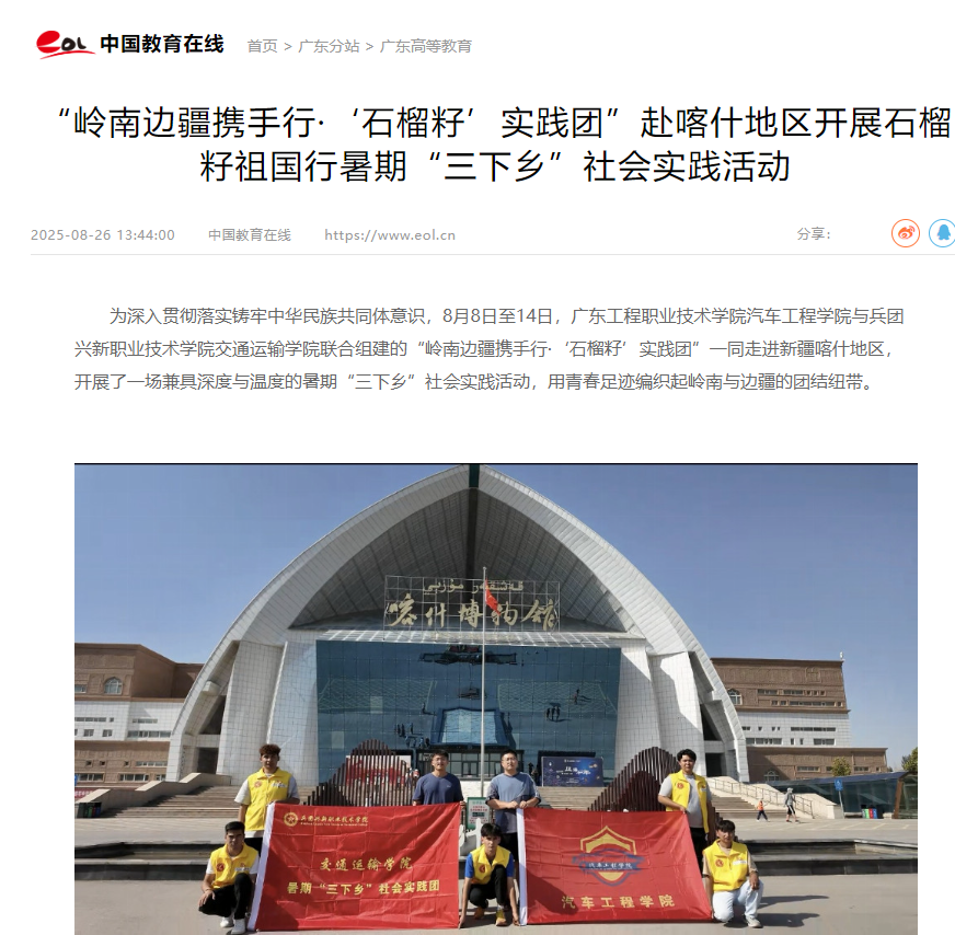 為深入貫徹落實鑄牢中華民族共同體意識,8月8日至14日,廣東工程職業(yè)技術學院汽車工程學院與兵團興新職業(yè)技術學院交通運輸學院聯(lián)合組建的“嶺南邊疆攜手行·‘石榴籽’實踐團”一同走進新疆喀什地區(qū),開展了一場兼具深度與溫度的暑期“三下鄉(xiāng)”社會實踐活動,用青春足跡編織起嶺南與邊疆的團結紐帶。
