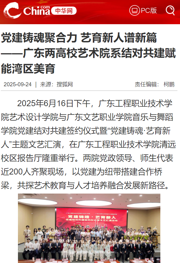 2025年9月24日《中華網(wǎng)》刊發(fā)文章《黨建鑄魂聚合力 藝育新人譜新篇——廣東兩高校藝術(shù)院系結(jié)對共建賦能灣區(qū)美育》,報(bào)道了我校藝術(shù)院系結(jié)對共建賦能灣區(qū)美育。