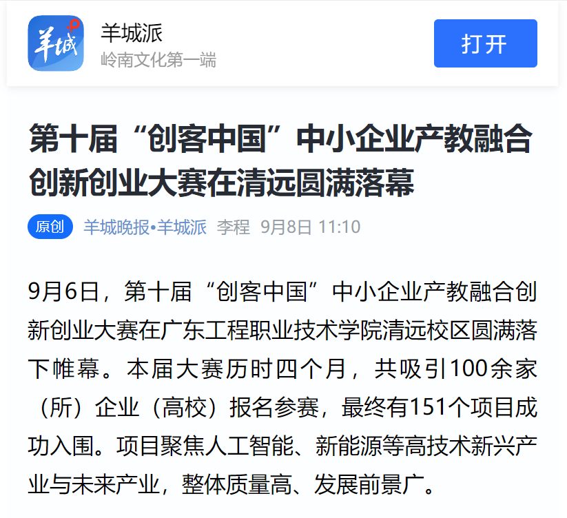 2025年9月8日《羊城晚報(bào)》刊發(fā)文章《第十屆“創(chuàng)客中國”中小企業(yè)產(chǎn)教融合創(chuàng)新創(chuàng)業(yè)大賽在清遠(yuǎn)圓滿落幕》,報(bào)道了我校舉辦第十屆“創(chuàng)客中國”中小企業(yè)產(chǎn)教融合創(chuàng)新創(chuàng)業(yè)大賽在清遠(yuǎn)圓滿落幕。