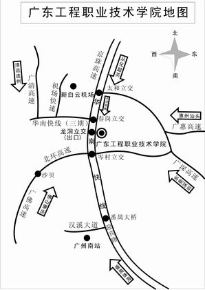 路線三:惠州方向進(jìn)入廣州→華南快速干線廣州方向→龍洞出口→匯東假日酒店右側(cè)進(jìn)入→龍洞東路→漁興路→廣東工程職業(yè)技術(shù)學(xué)院