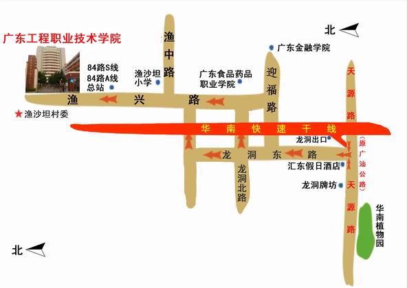 路線二:佛山沙貝方向進(jìn)入廣州→北環(huán)高速岑村出口→華南快速干線京珠方向→龍洞出口→匯東假日酒店右側(cè)進(jìn)入→龍洞東路→漁興路→廣東工程職業(yè)技術(shù)學(xué)院