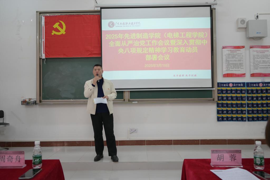 為進(jìn)一步加強黨的紀(jì)律建設(shè)、推動全面從嚴(yán)治黨向縱深發(fā)展。根據(jù)我校2025年全面從嚴(yán)治黨工作會議暨深入貫徹中央八項規(guī)定精神學(xué)習(xí)教育動員部署會議內(nèi)容,先進(jìn)制造學(xué)院(電梯工程學(xué)院)黨委于3月19日在清遠(yuǎn)校區(qū)教學(xué)樓Q1-114召開了2025年全面從嚴(yán)治黨工作會議暨深入貫徹中央八項規(guī)定精神學(xué)習(xí)教育動員部署會議。本次會議由周奇舟書記主持。